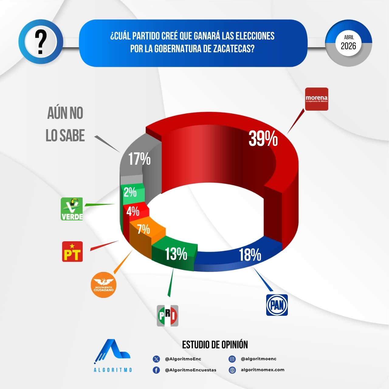 El análisis estadístico de la intención de voto para la gubernatura de Zacatecas en 2027, fundamentado en los levantamientos de Demoscopia (12 al 15 de abril de 2026) y Algoritmo (18 al 21 de abril de 2026), proyecta una ventaja consolidada para el partido Movimiento Regeneración Nacional (Morena). Según los datos procesados, la marca oficialista concentra un 39% de la preferencia bruta, marcando una brecha de 21 puntos porcentuales sobre su competidor más cercano, el Partido Acción Nacional (PAN), que registra un 18%.