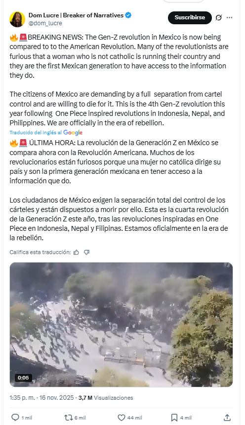 El influencer estadounidense Dom Lucre fue uno de los primeros en amplificar los hechos, calificando la protesta como “la cuarta revolución Gen-Z del año” y asegurando que los jóvenes mexicanos se levantaron “para separar al país del control de los cárteles”. Su mensaje, viral con millones de reproducciones, vinculó la movilización mexicana con protestas registradas previamente en Indonesia, Nepal y Filipinas, aun cuando no existe evidencia de una coordinación internacional de este tipo.