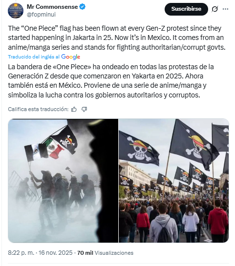 A la narrativa generacional se sumó Mr Commonsense, quien destacó el uso de banderas inspiradas en One Piece, interpretándolas como símbolos universales de resistencia contra gobiernos autoritarios. Aunque en México el uso de esta iconografía fue aislado y marginal, afuera se convirtió en un potente elemento visual para encuadrar la protesta como parte de un fenómeno juvenil global con estética pop.